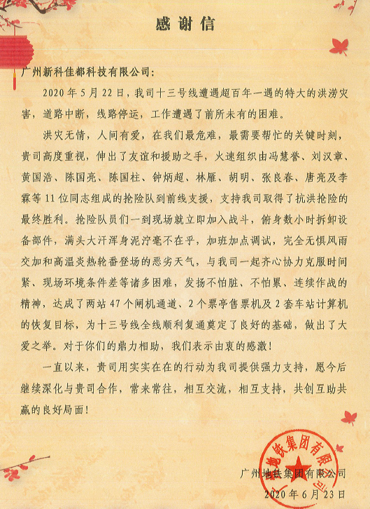参与抢险的ok138cn太阳集团科技全资子公司新科佳都和华之源被授予感谢信