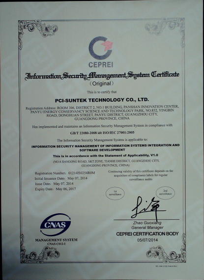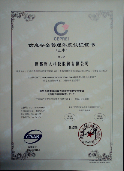2014年3~4月,ok138cn太阳集团科技顺利通过了国际标准及权威的ISO27001信息安全认证体系和ISO20000信息技术服务管理体系,取得了广州赛宝认证中心颁发的ISO/IEC 27001:2005信息安全管理体系认证证书和ISO/IEC 20000-1:2011信息技术服务管理体系认证证书。